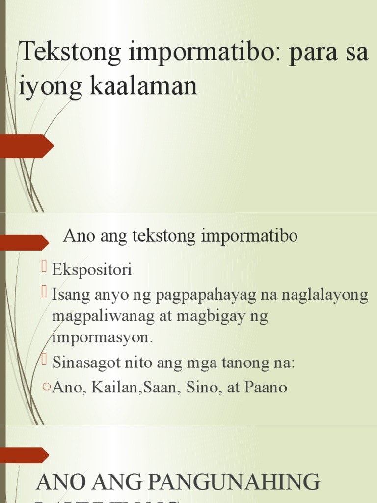 Ibat ibang Uri ng Tekstong. May ibat ibang uri ang tekstong impormatibo depende sa estruktura ng paglalahad nito. Para sa Iyong Kaalaman Kahulugan at Kahalagahan ng Tekstong Impormatibo Minsan ay tinatawag ding ekspositori isang anyo ng pagpapahayag na naglalayong magpaliwanag at magbigay ng impormasyon.