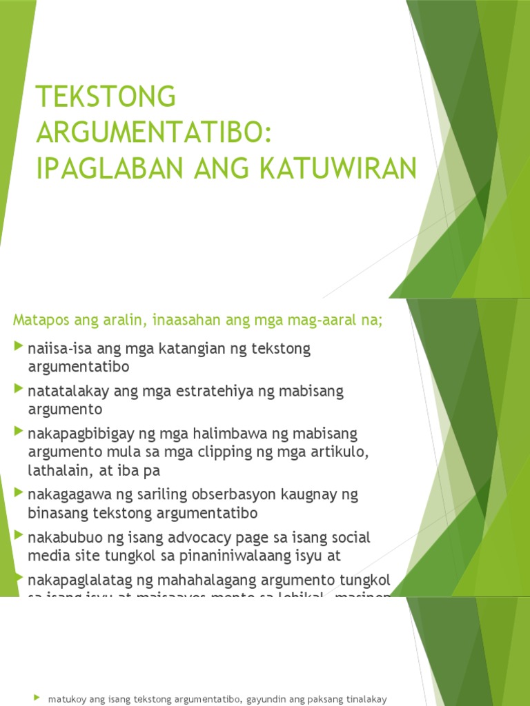 Ang argumentatibo at persuweysib ay dalawa lamang sa mga uri ng teksto. 2 Maikli ngunit malaman at malinaw na pagtukoy sa tesis sa unang. 4 Maayos na pagkakasunod-sunod ng.