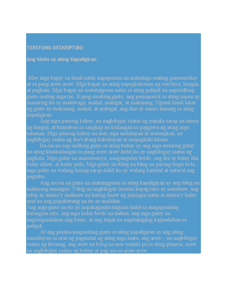 Ito ay maaaring maging tungkol sa isang bagay tao haop pangyayari o kwento na pwede maging tototoo o hindi. Alam naten na meron pa tayong minamahal bukod sa pamilya naten. Tekstong deskriptibo Mula sa epektibong paglalarawan ay halos makikita maaamoy maririnig malalasahan o.