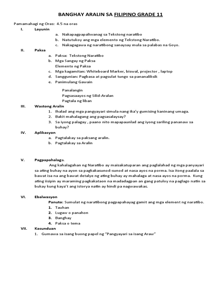 Di- Masusing Banghay Aralin Sa Filipino II Layunin Pagkatapos ng leksyon ang mga mag-aaral ay inaasahang. Pages 5 This preview. Ito ay kalimitang may apat o limang bahagi.