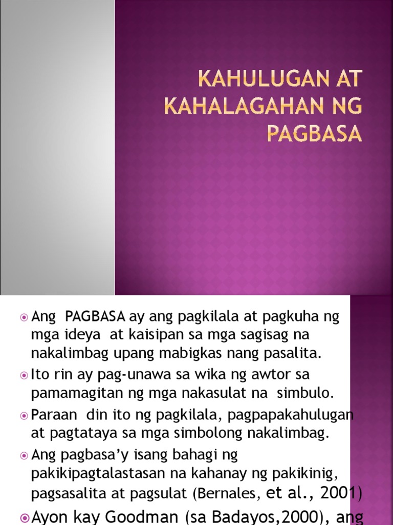 Ang pagbasay isang bahagi ng pakikipagtalastasan na kahanay ng pakikinig pagsasalita at pagsulat Bernales et al 2001 Ayon kay Goodman sa Badayos2000 ang pagbasa ay isang psycholinguistic guessing game. Upang matukoy ang tiyak na direksyon 6.