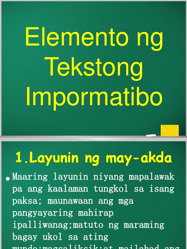 Ang tekstong impormatibo ay isang uri ng pagpapahayag na ang layunin ay makapagbigay ng impormasyon. Mga Elemento ng Tekstong Impormatibo. Ano ang Tekstong Impormatibo.