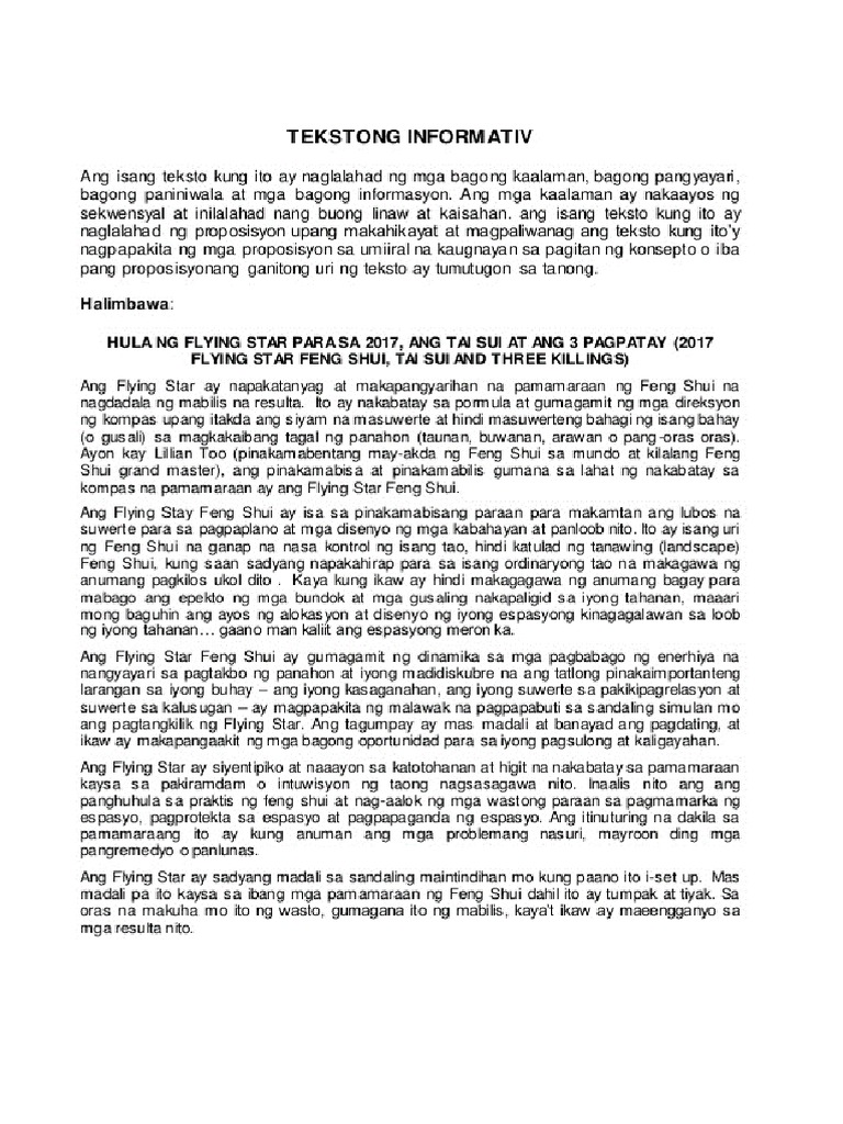 Halimbawa Sumulat ng isang Tekstong Impormatibo batay sa katangian at kalikasan na taglay nito. 3 Gawain PANUTO. Ito ay nagbibigay ng mga impormasyong nakapagpapalawak ng kaalaman ay nagbibigay liwanag sa mga paksang inilalahad upang mapawi nang lubos ang.