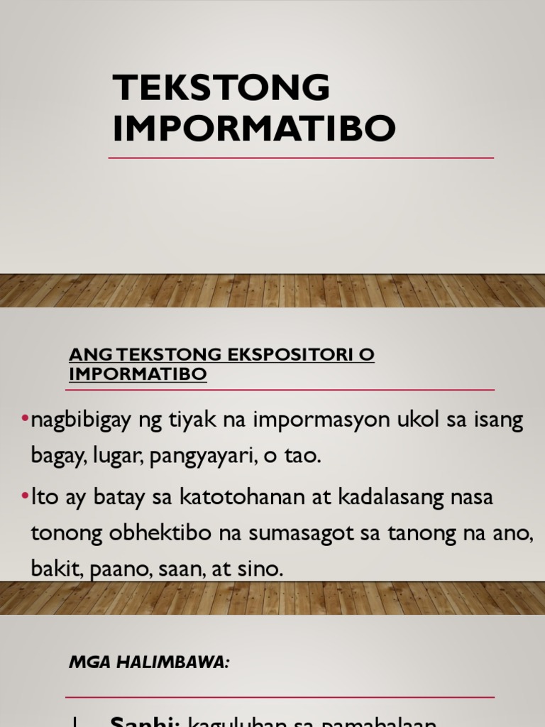 Sa ibang terminolohiya tinatawag din itong ekspositori. Sa kadahilanan kung kaya upang at ibp -May mga akdang maaangkupan ng hulwarang ito gya ng mga balita alamat. Ang tekstong impormatibo ay isang uri ng teksto na nagbibigay kaalaman sa.