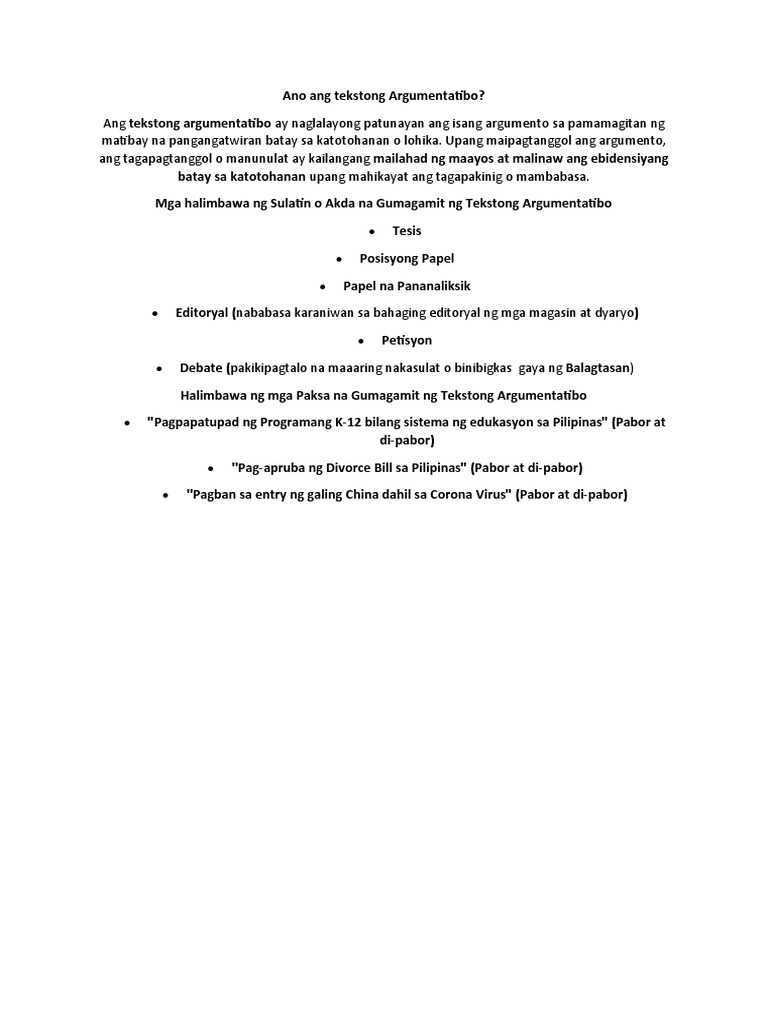 Mga halimbawa ng mga pangungusap na gumagamit ng. Kahulugan ng Tekstong Argumentatibo at Mga Halimbawa nito Kahulugan ng Tekstong Argumentatibo. Nakasusunod sa istilo at teknikal na pangangailangan ng akademikong sulatin 3.